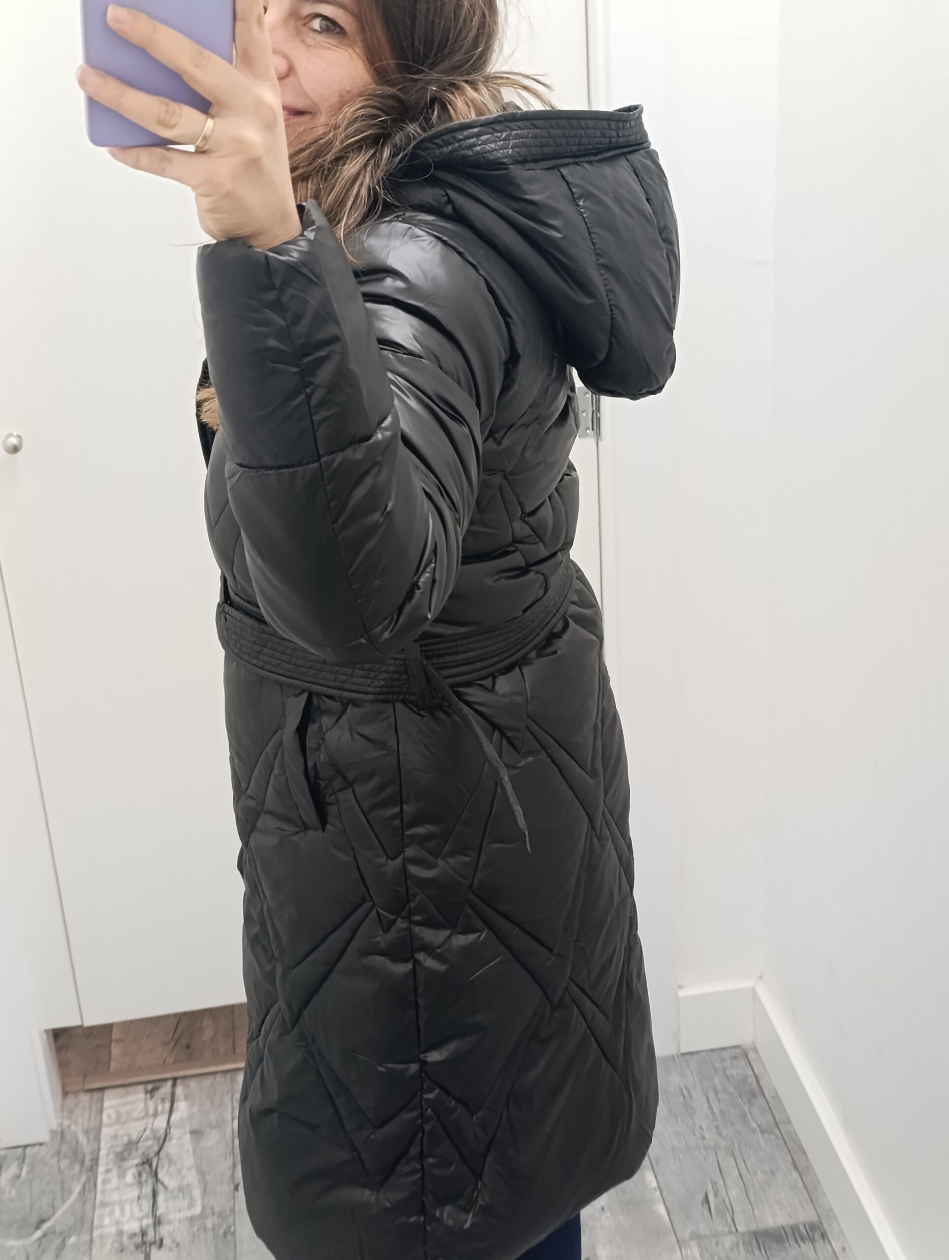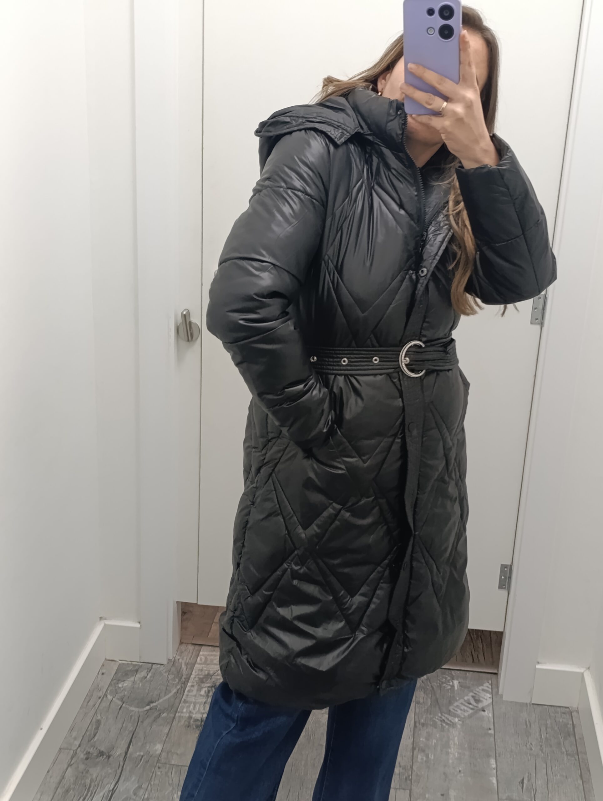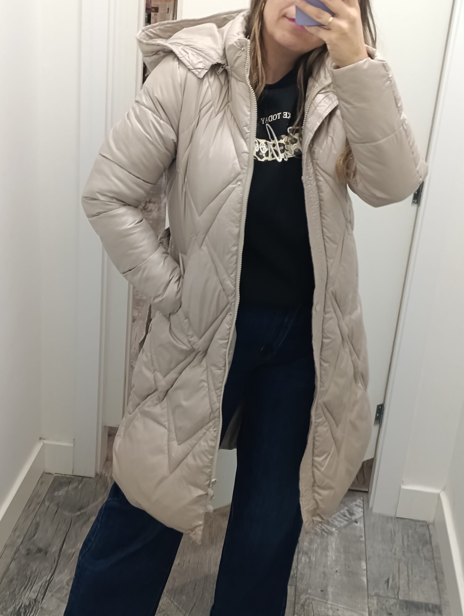 Abrigo acolchado con capucha desmontable . La cremallera abre tanto para abajo como para arriba.