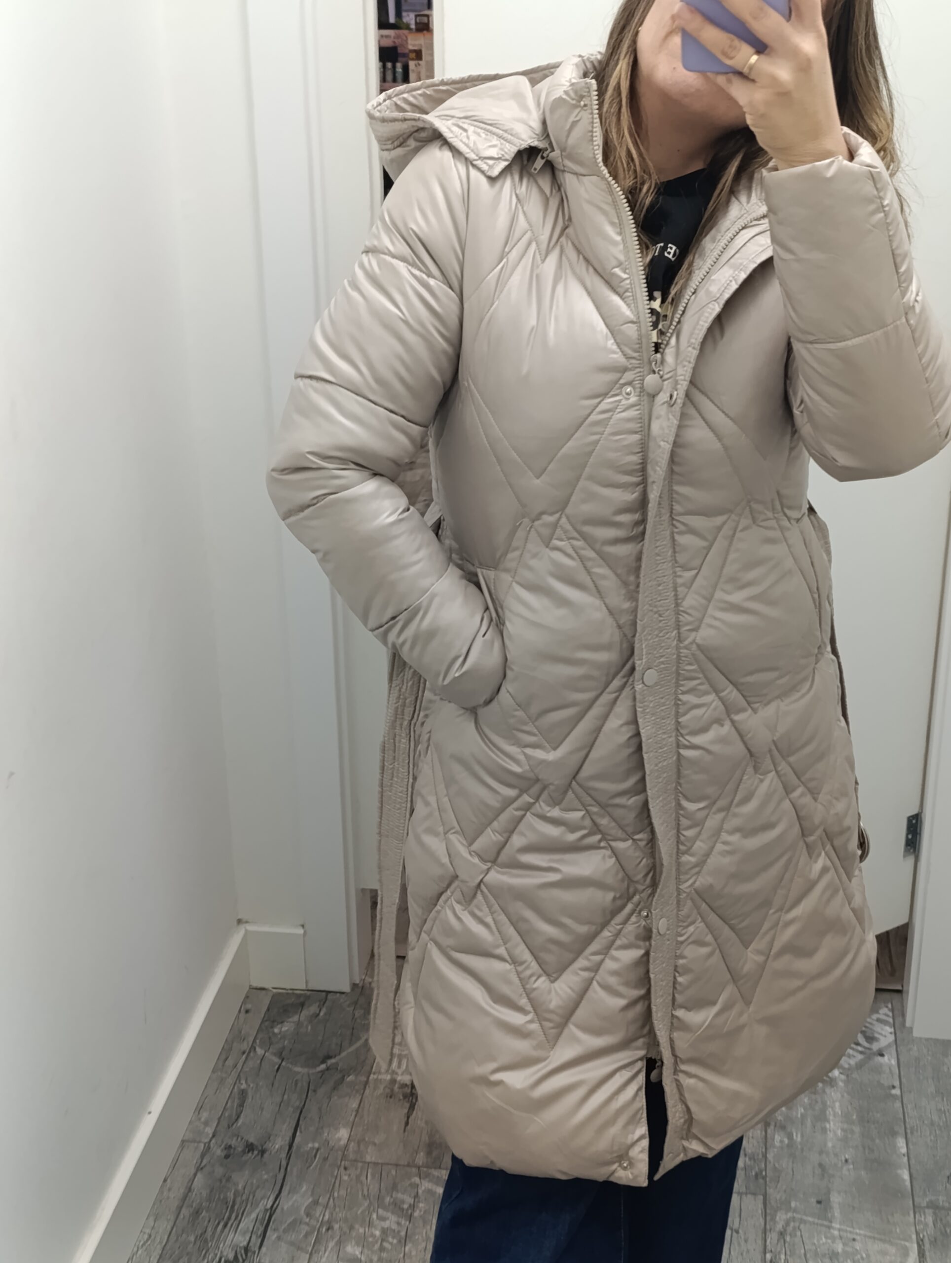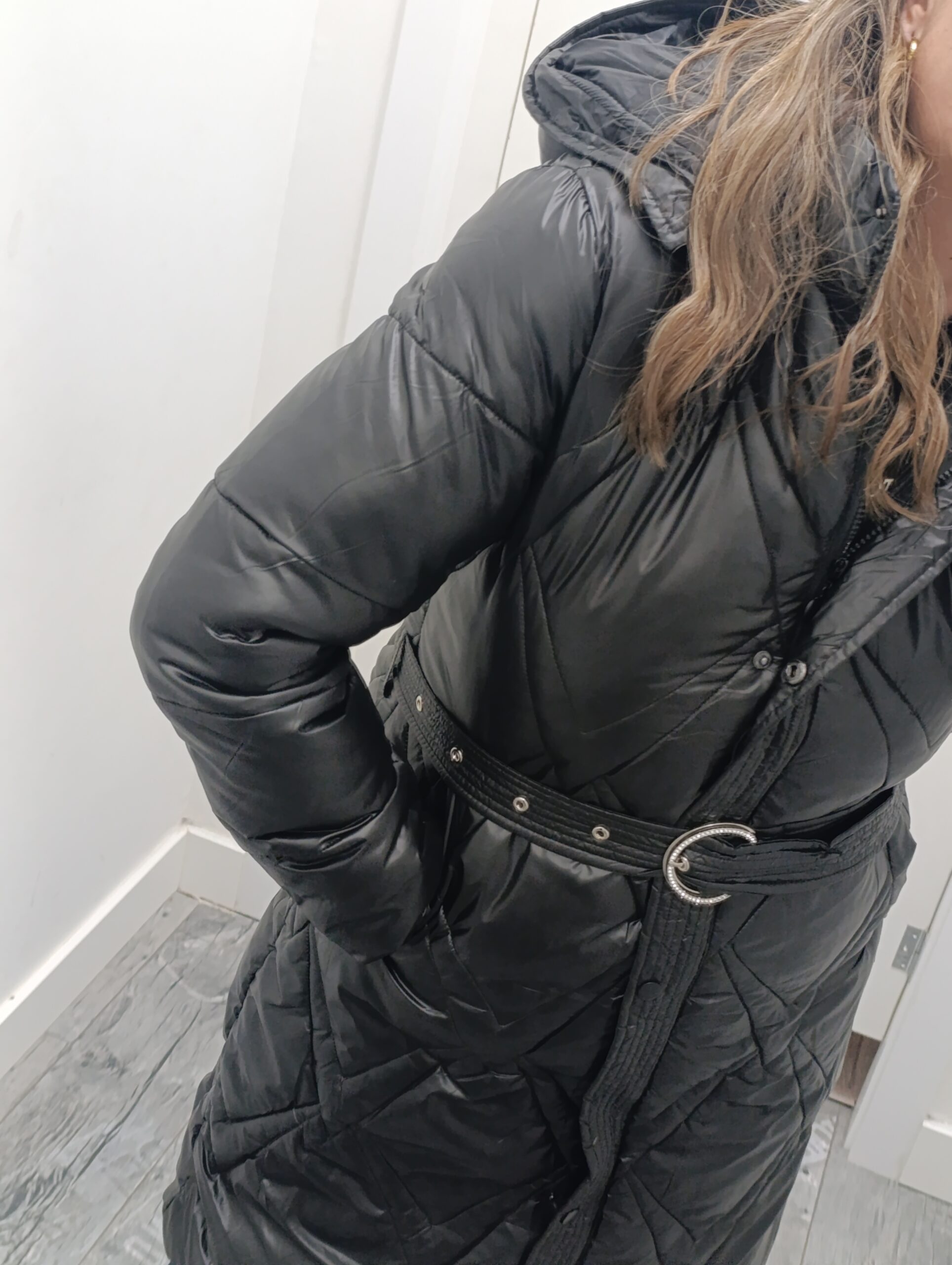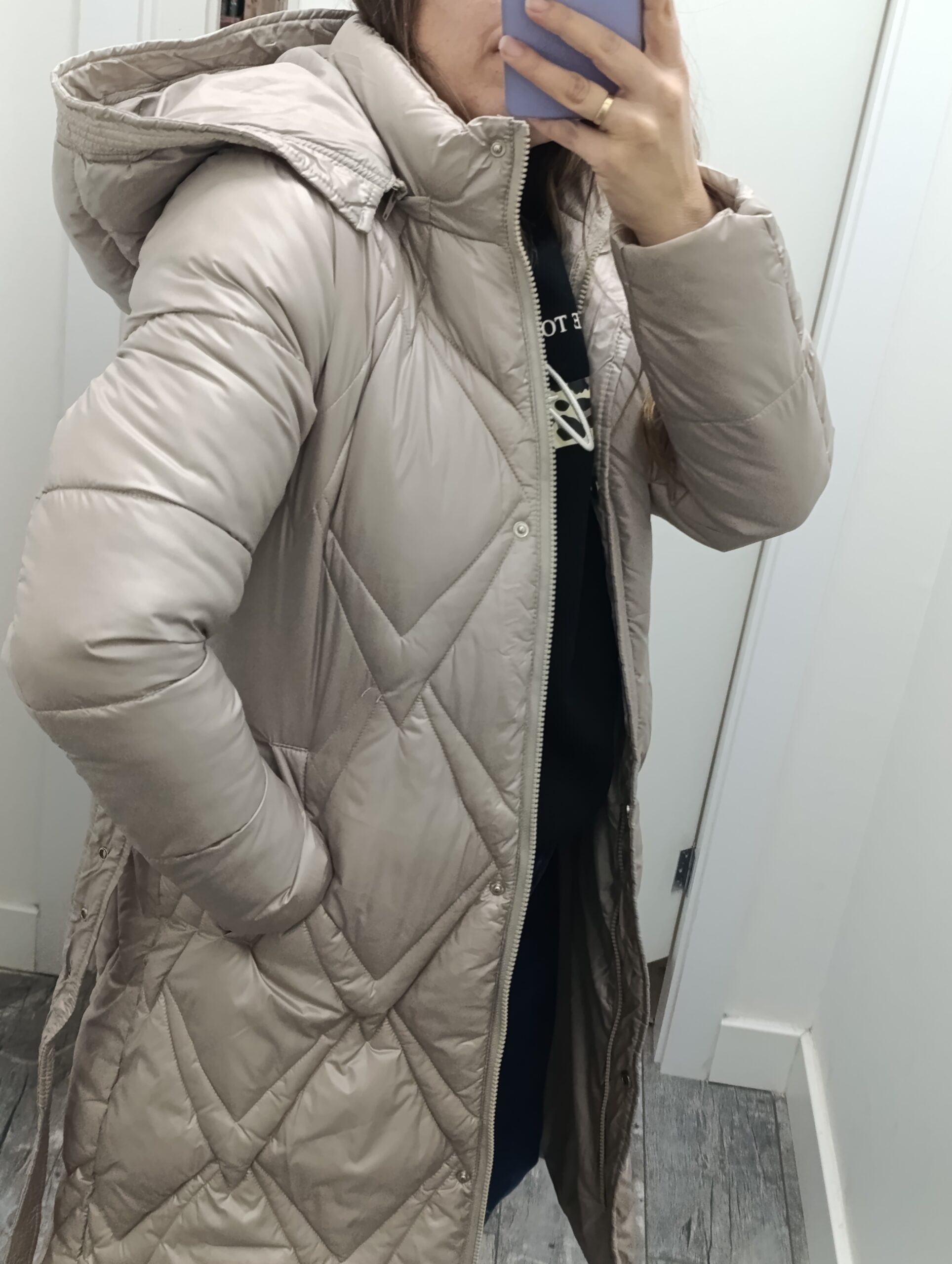 Abrigo acolchado con capucha desmontable . La cremallera abre tanto para abajo como para arriba.