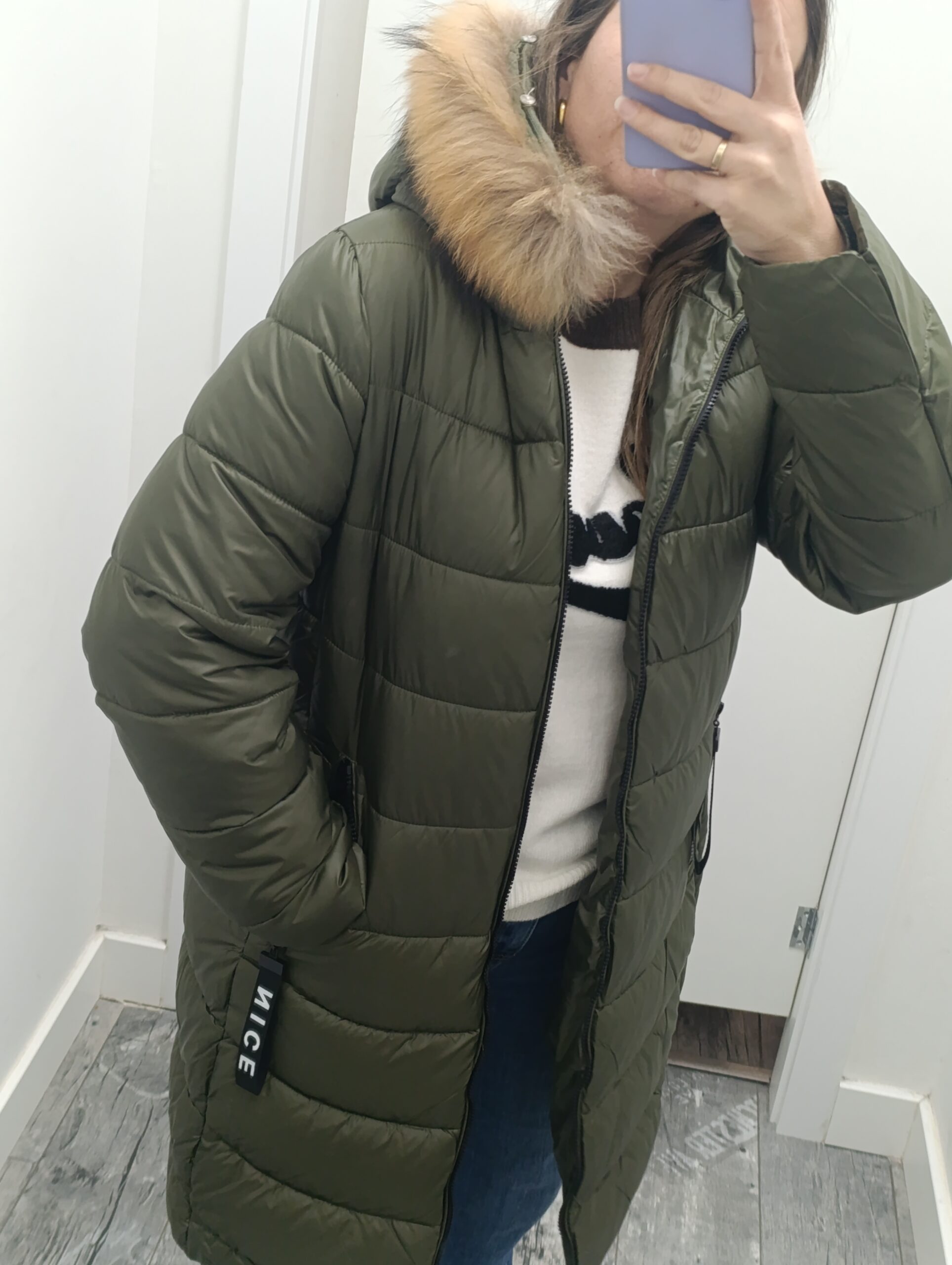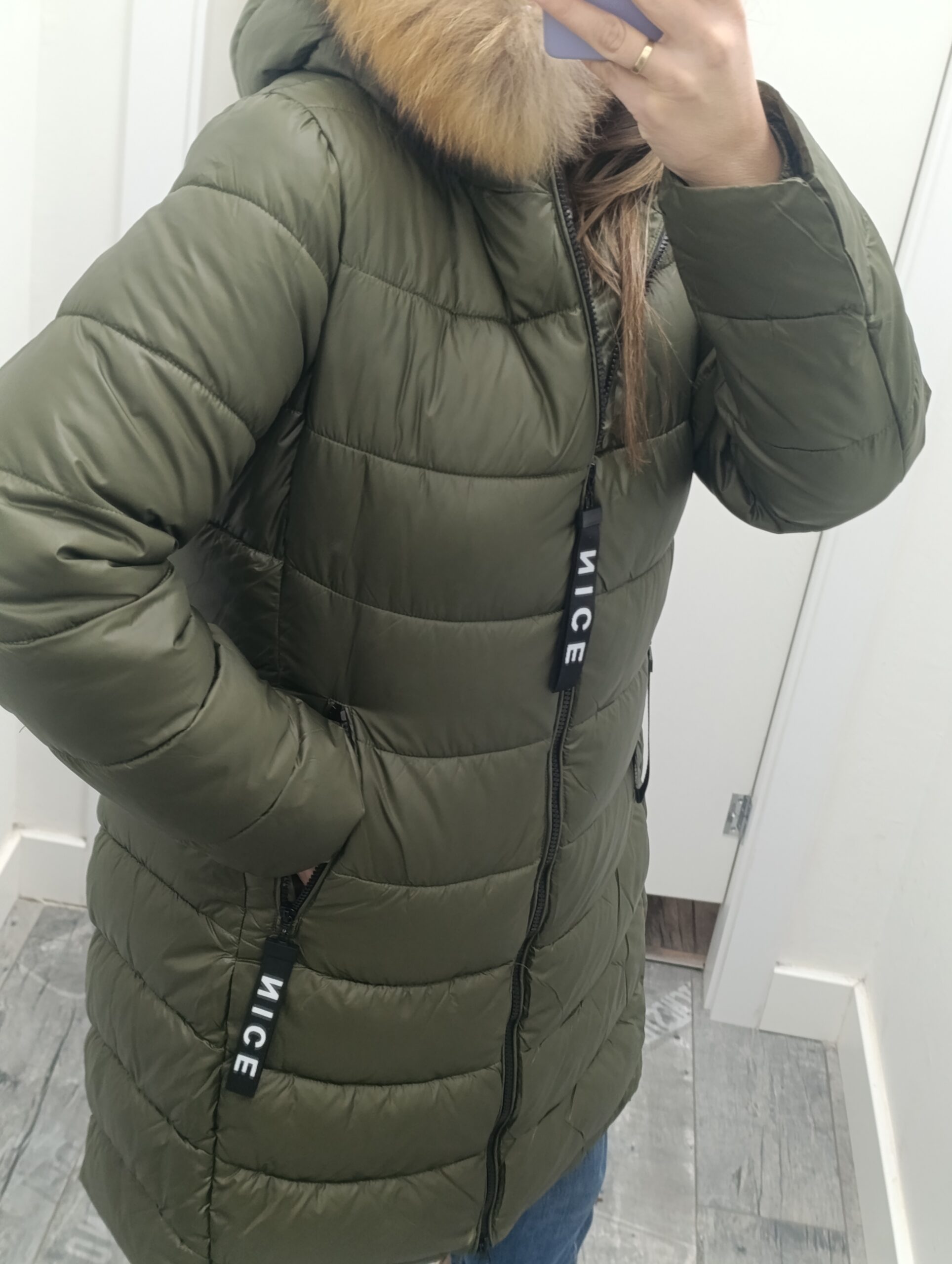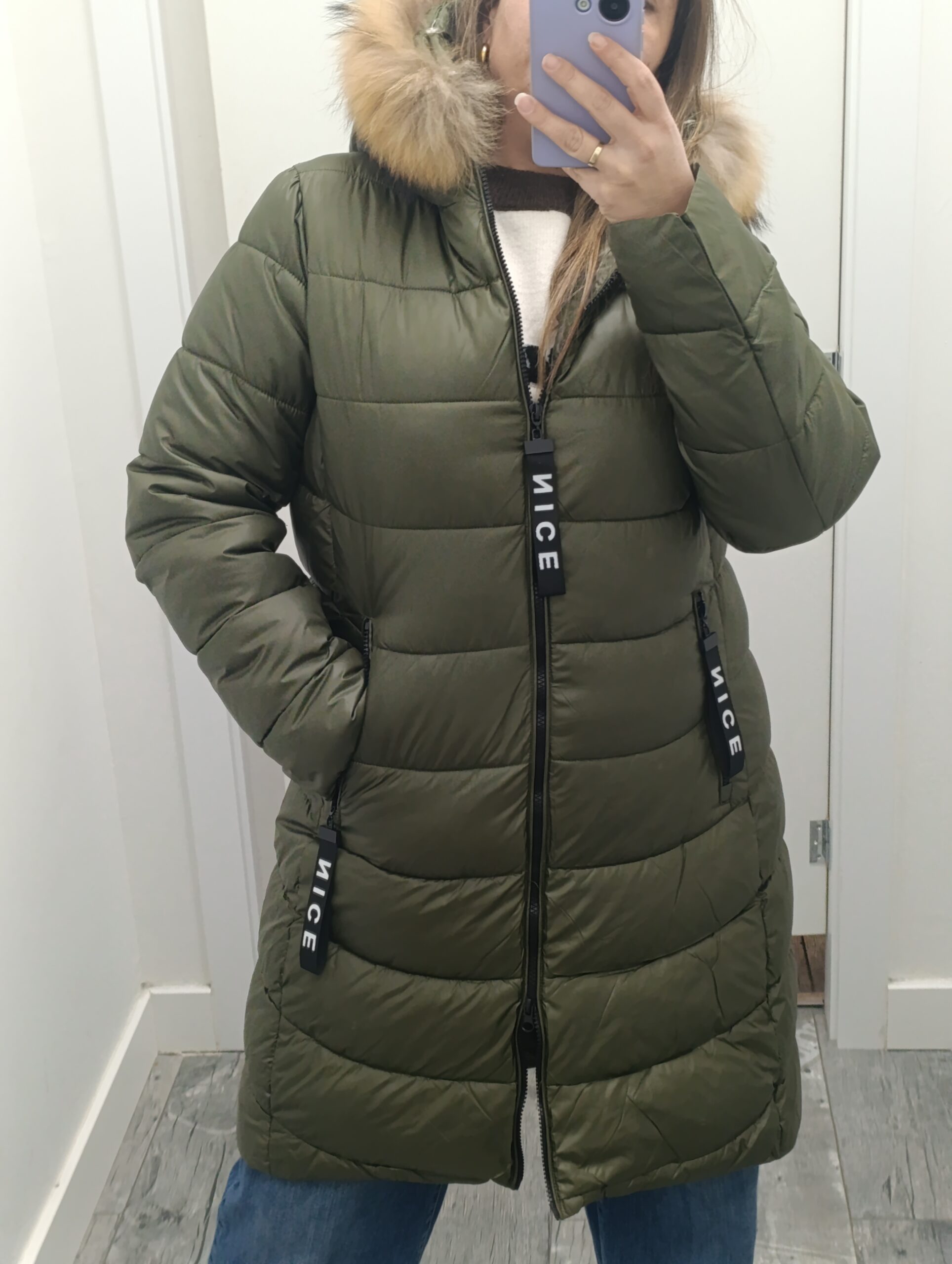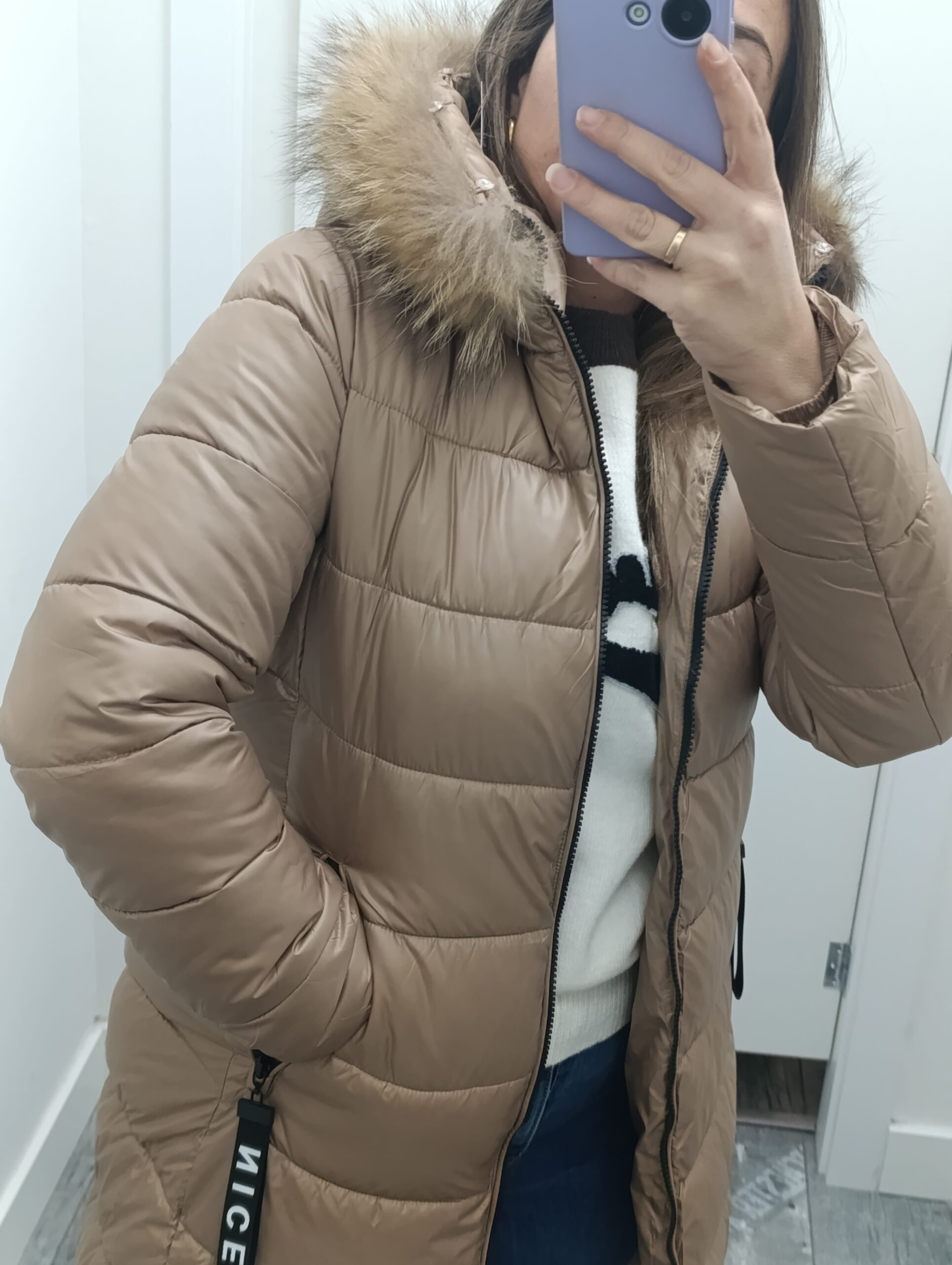 Abrigo largo acolchado con doble cremallera. Lleva cremallera en los bolsillos y el pelo de la capucha se puede quitar
