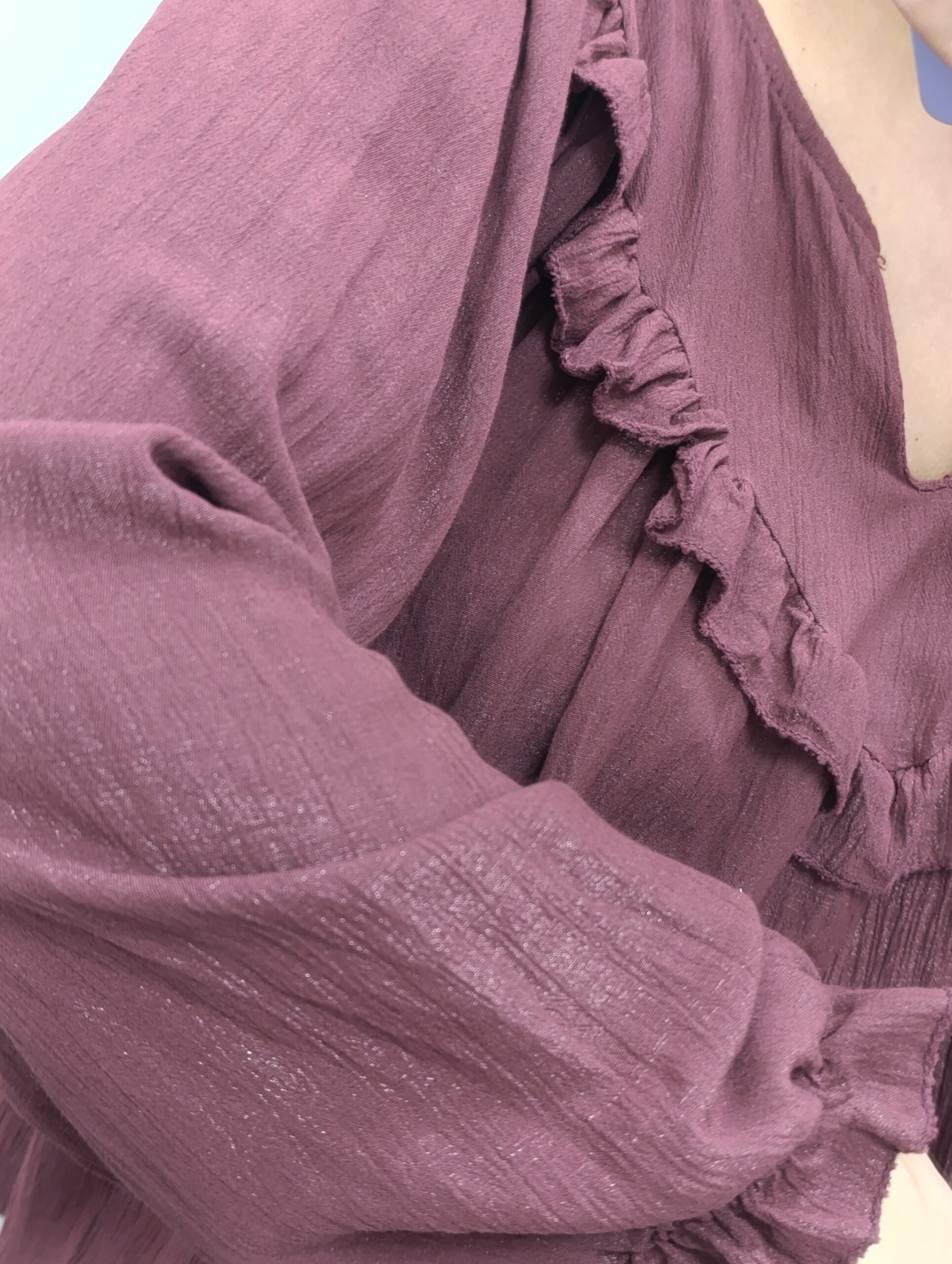 Blusa en tejido tipo bambula con detalle de hilo dorado. Con goma en la manga. Viene en talla única válido hasta una 42-44