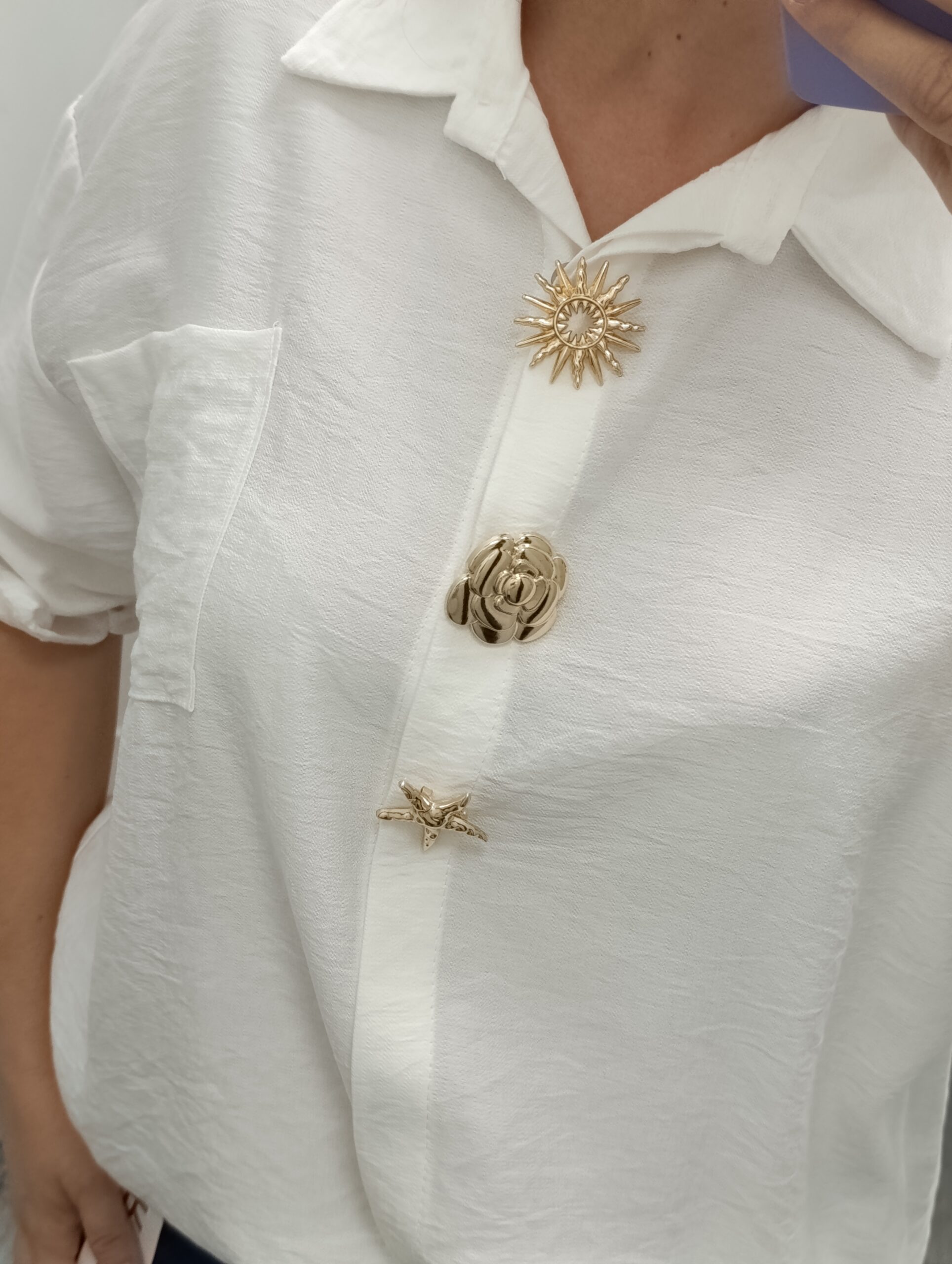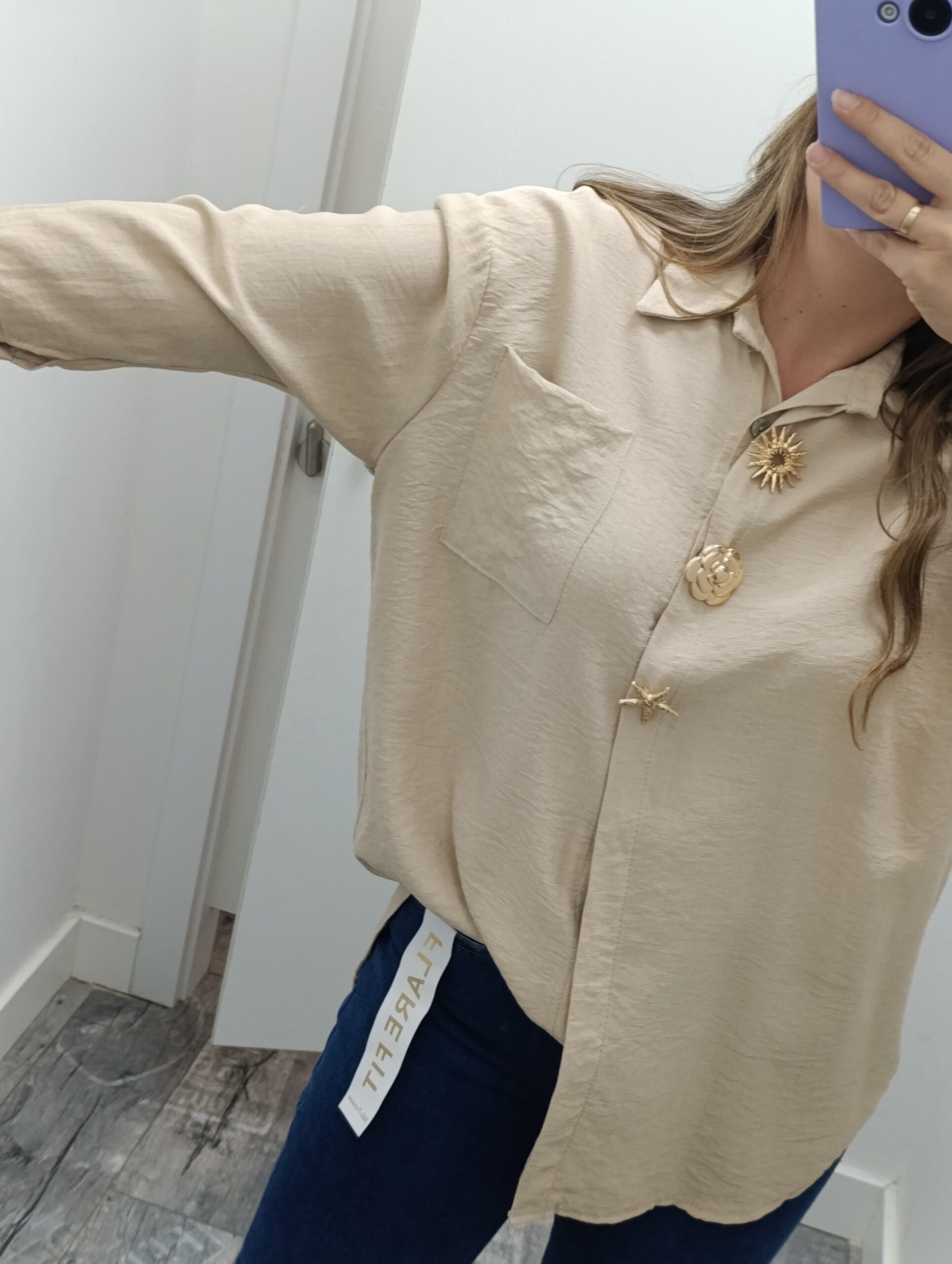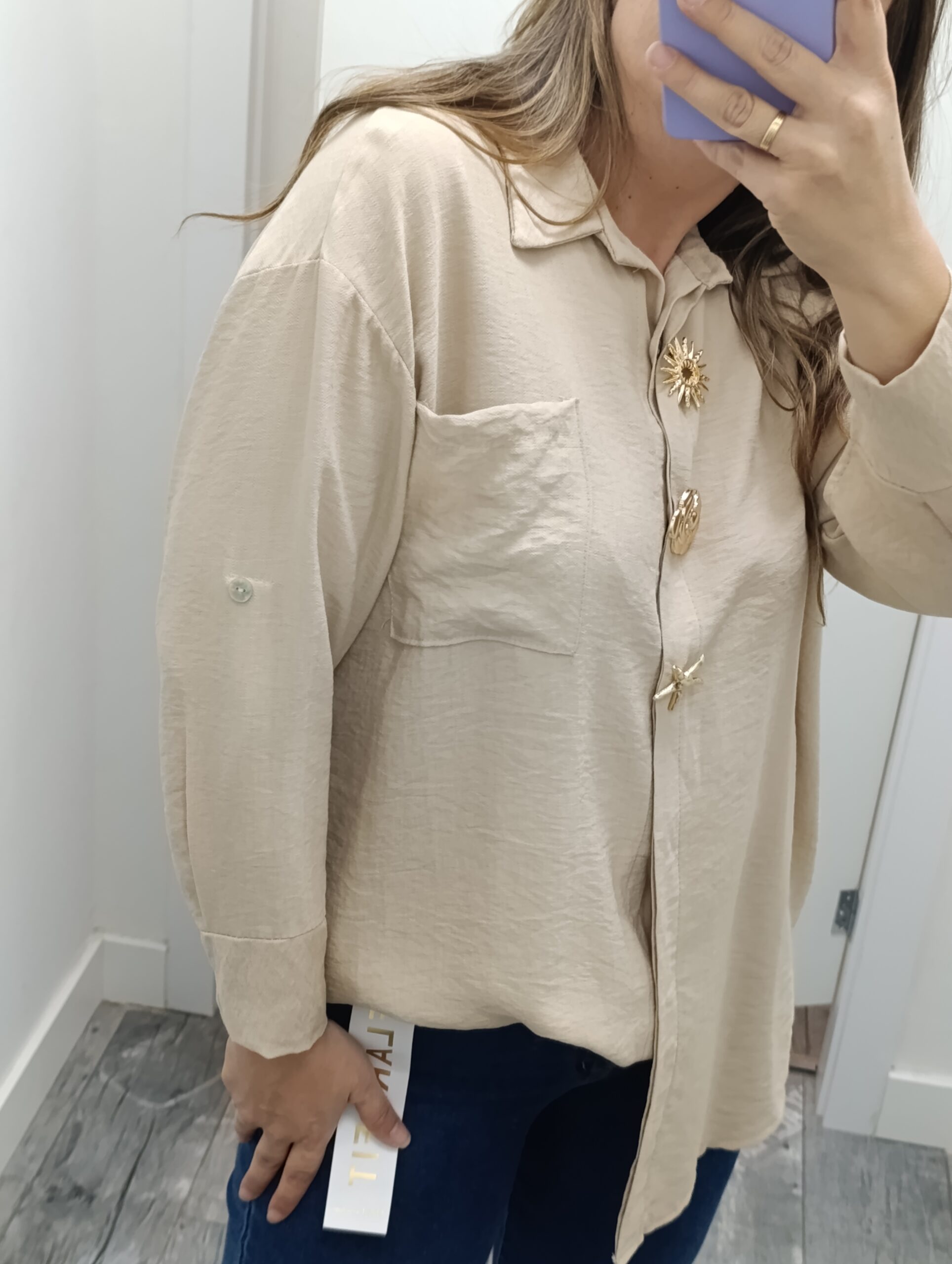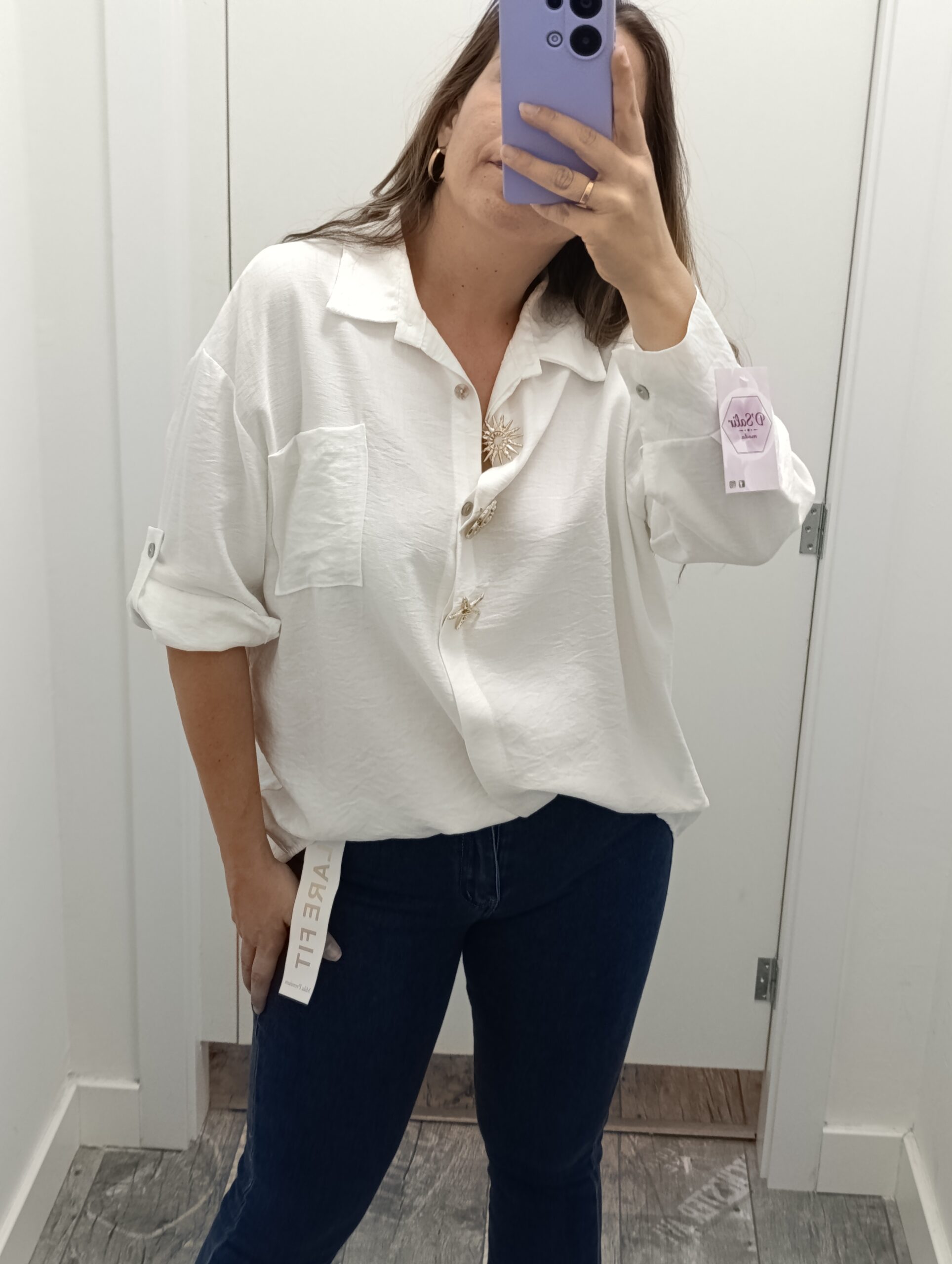 Camisa en talla única válido hasta una 42/44. Un poquito más larga de la parte trasera, abotonada y con el detalle de los broches en dorado los cuales se pueden quitar
