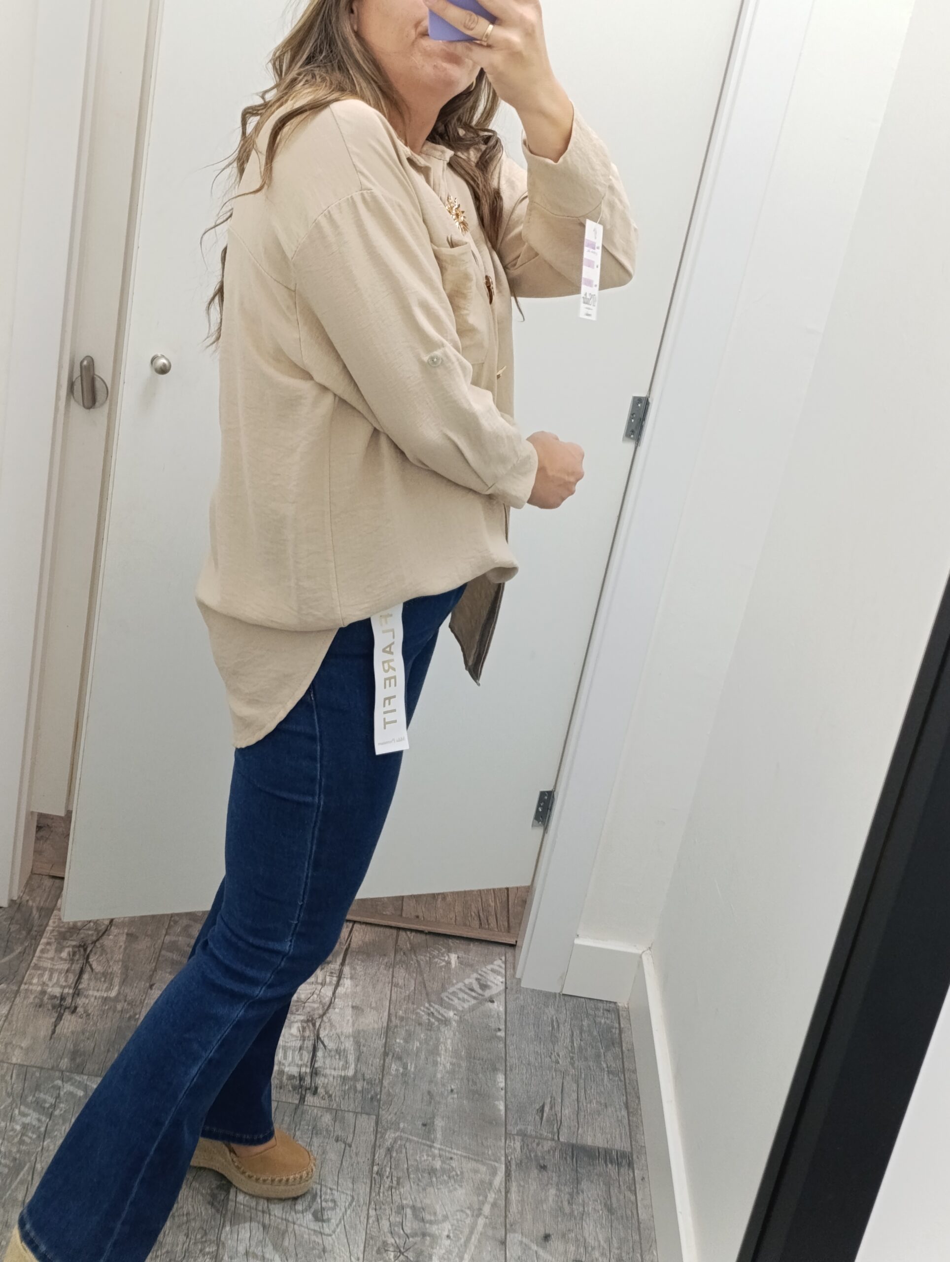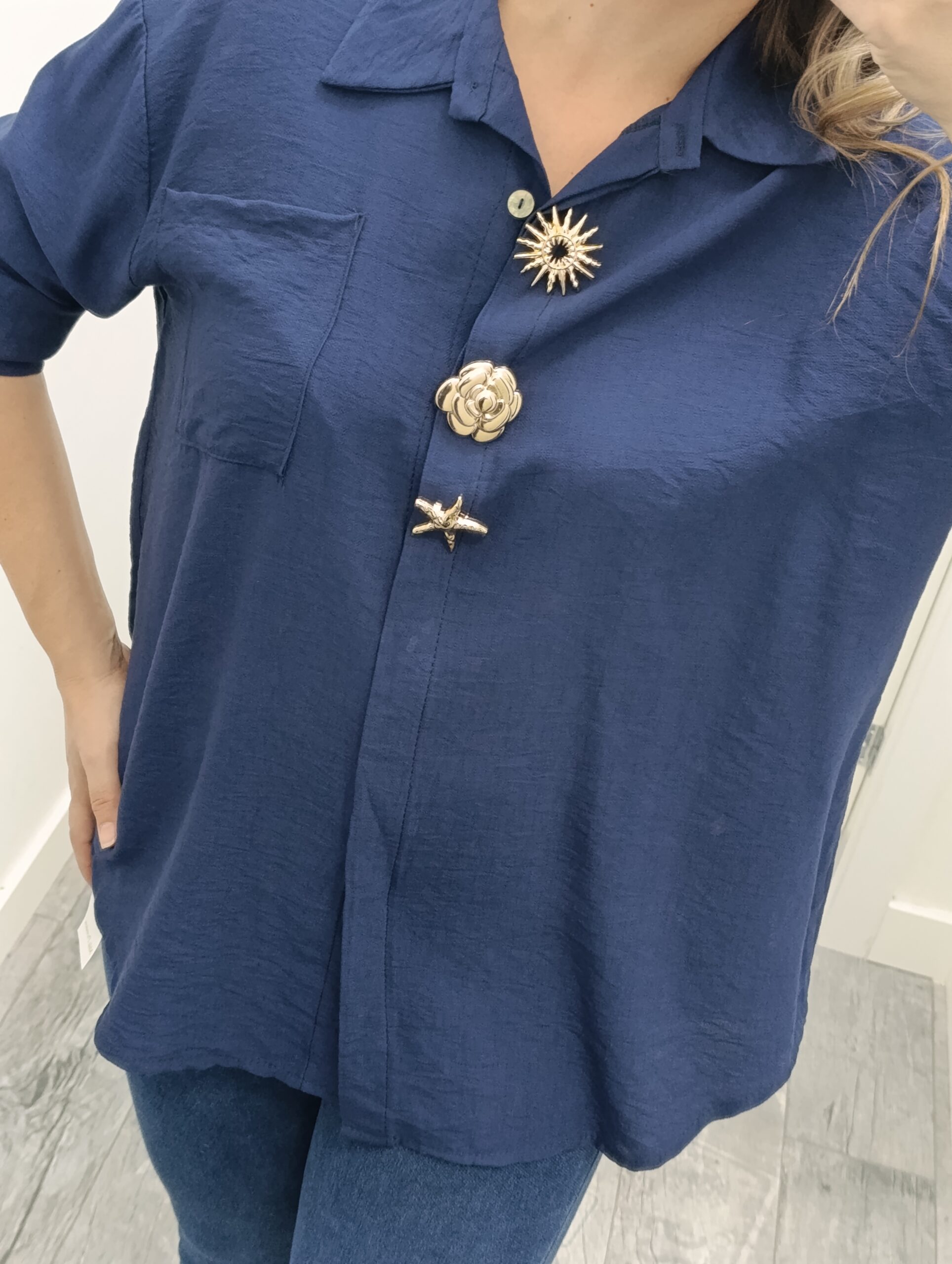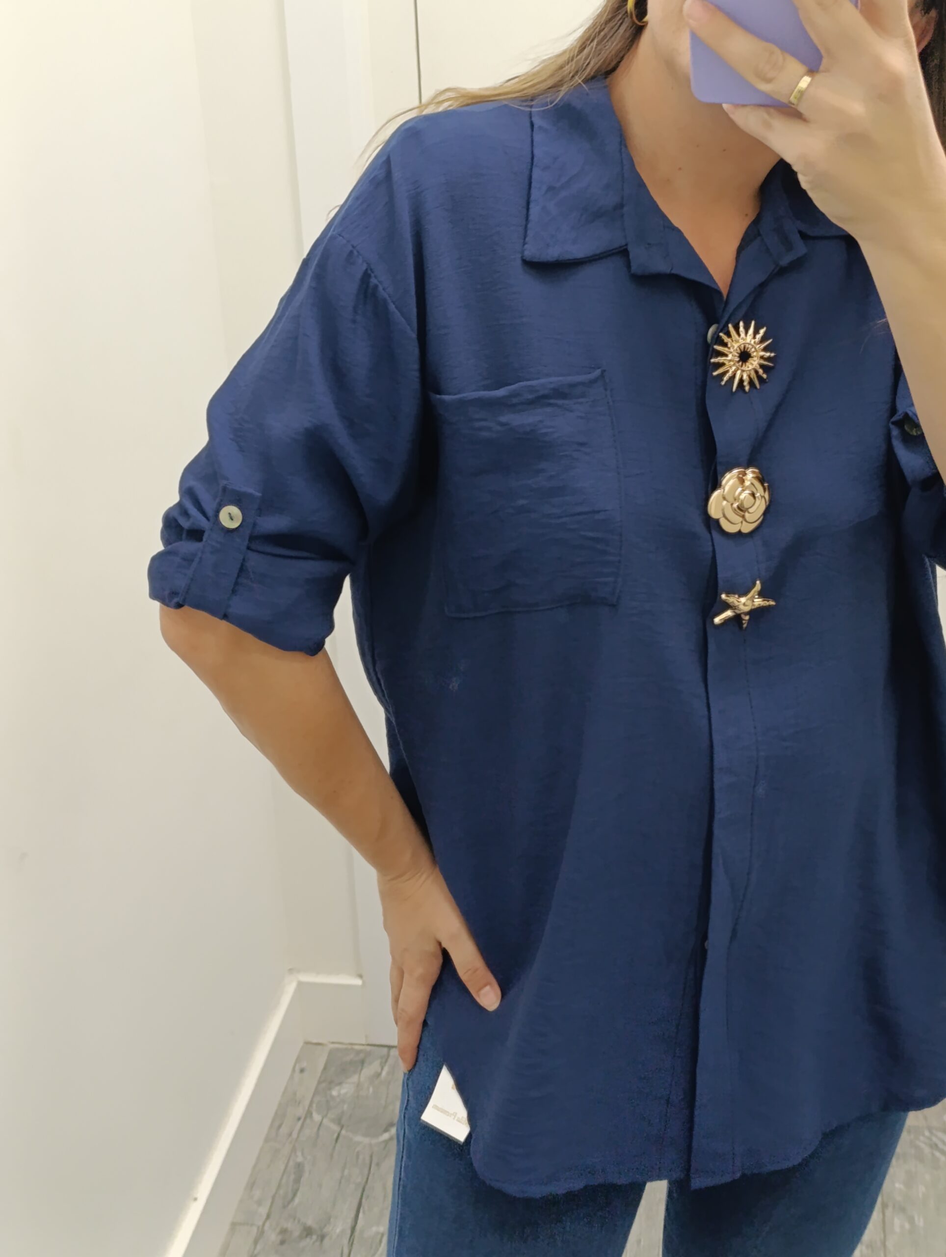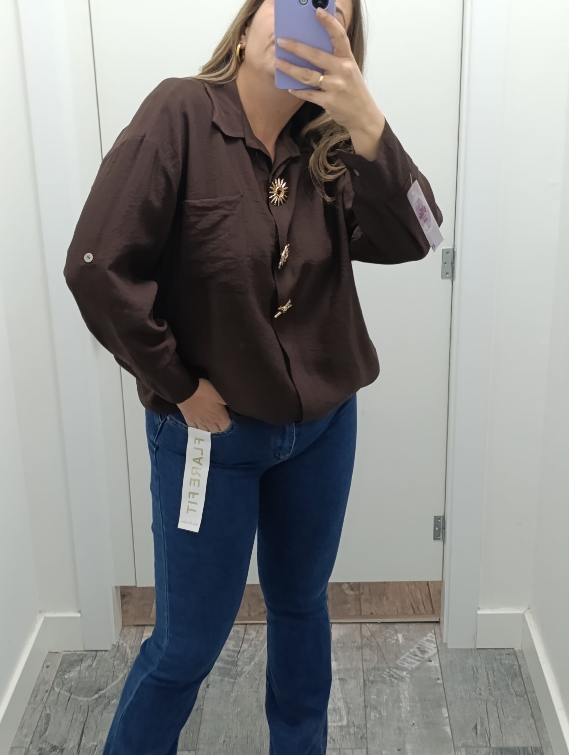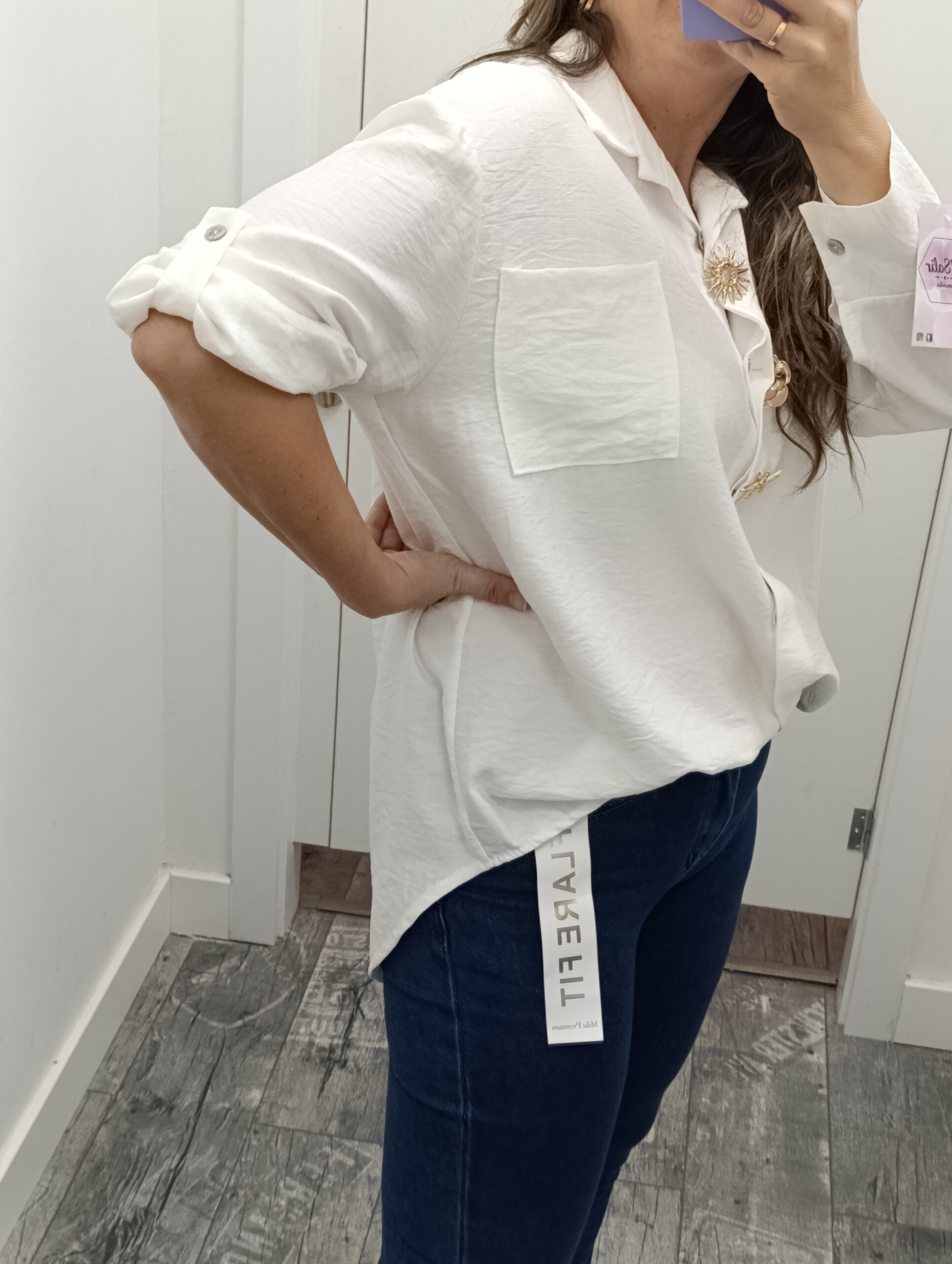 Camisa en talla única válido hasta una 42/44. Un poquito más larga de la parte trasera, abotonada y con el detalle de los broches en dorado los cuales se pueden quitar