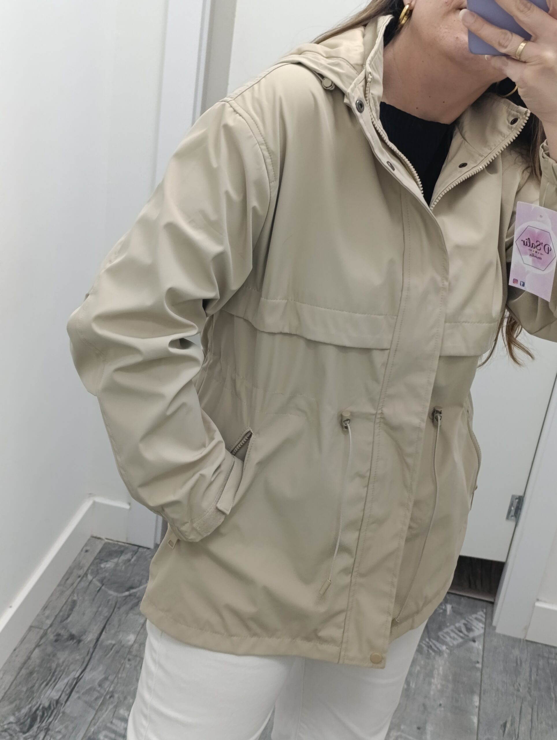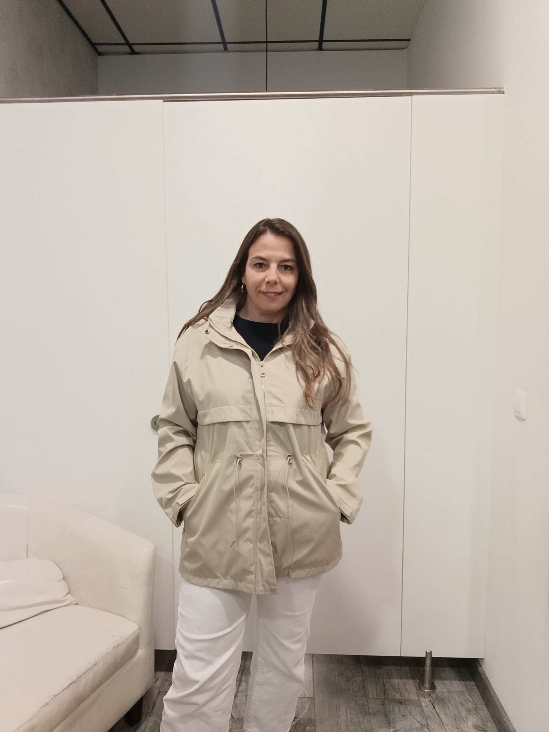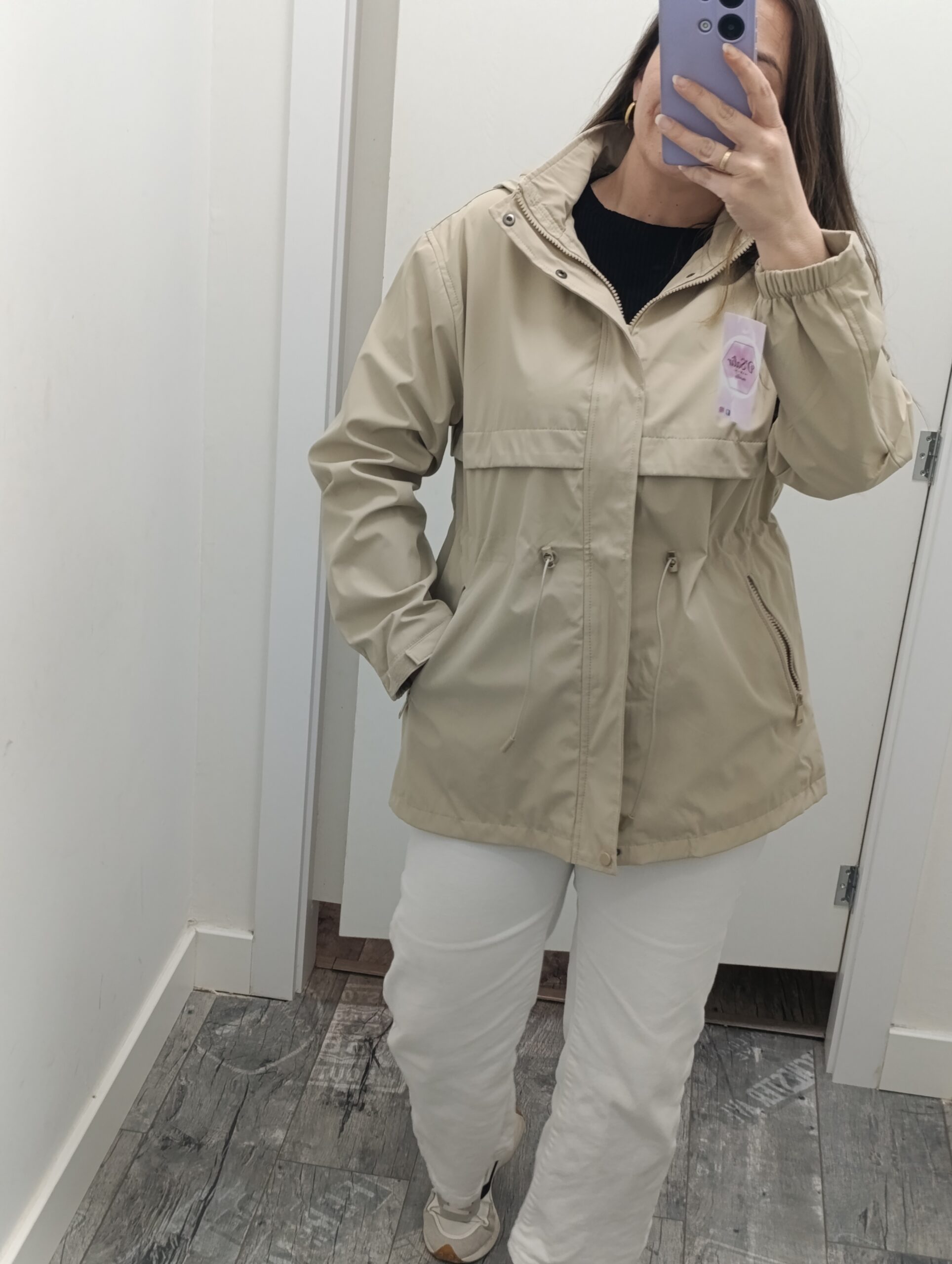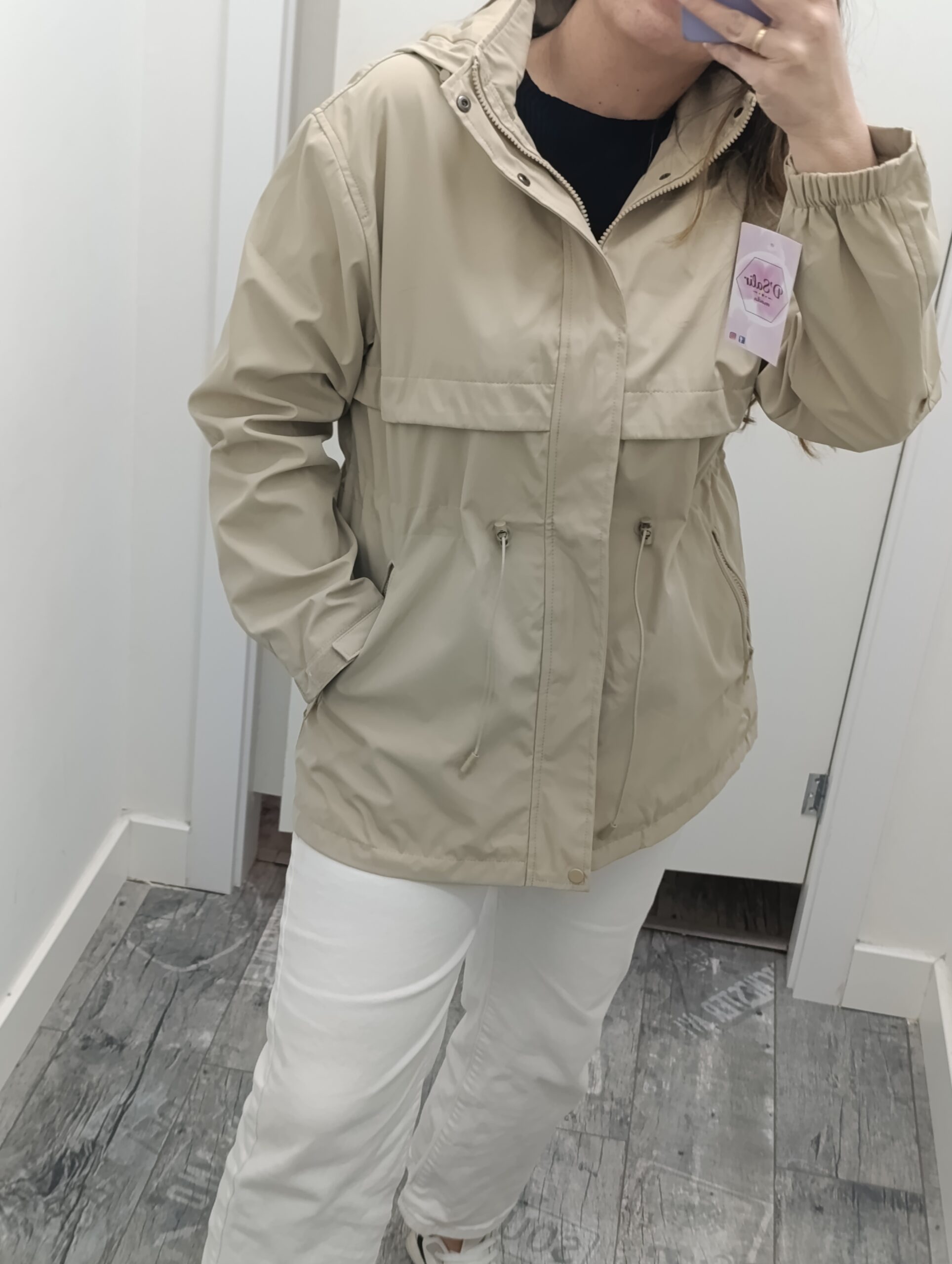 Cazadora con capucha desmontable, lleva bolsillos y goma para poder ajustar la cintura.