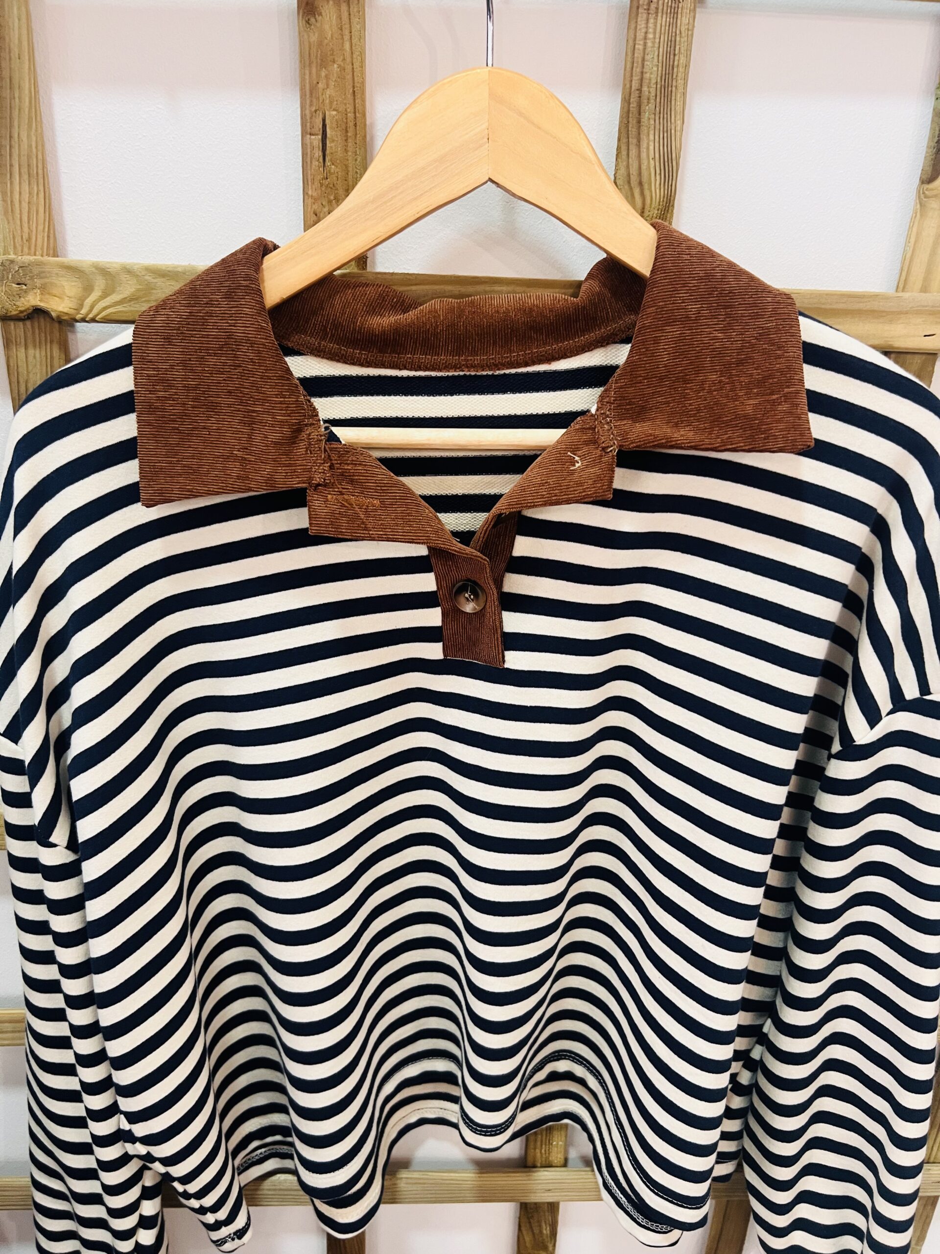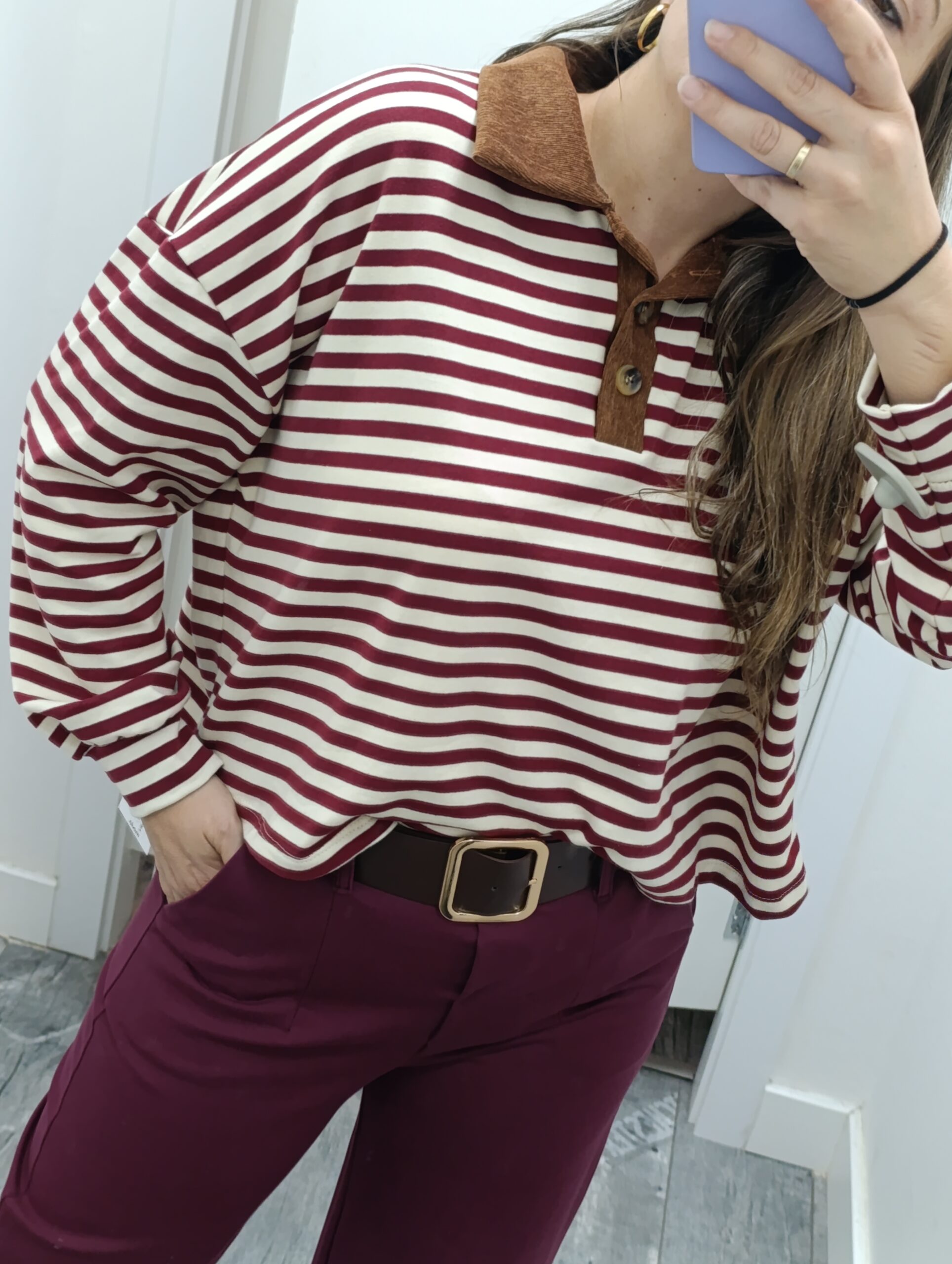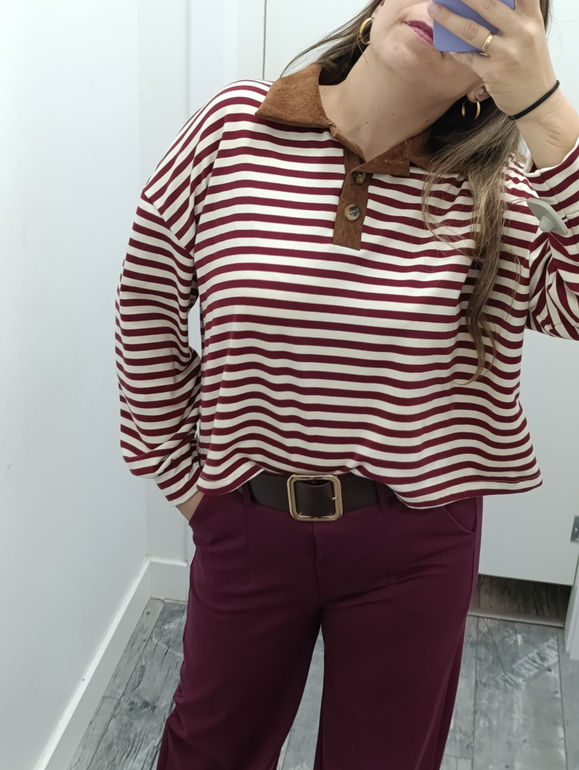 Camiseta tipo polo con cuello en antelina marron. Es talla única valido hasta una 42.